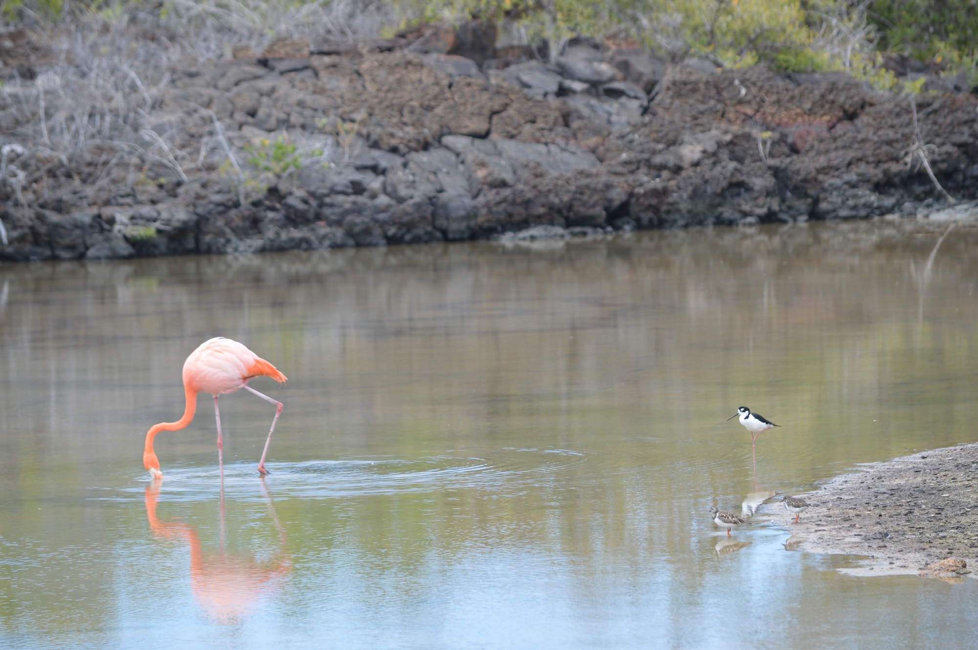 Its wildlife ranges from basking marine iguanas, perched boobies and pelicans, stalking herons, Galapagos penguins, sea lions, turtles and white tipped sharks (locally known as tintoreras).